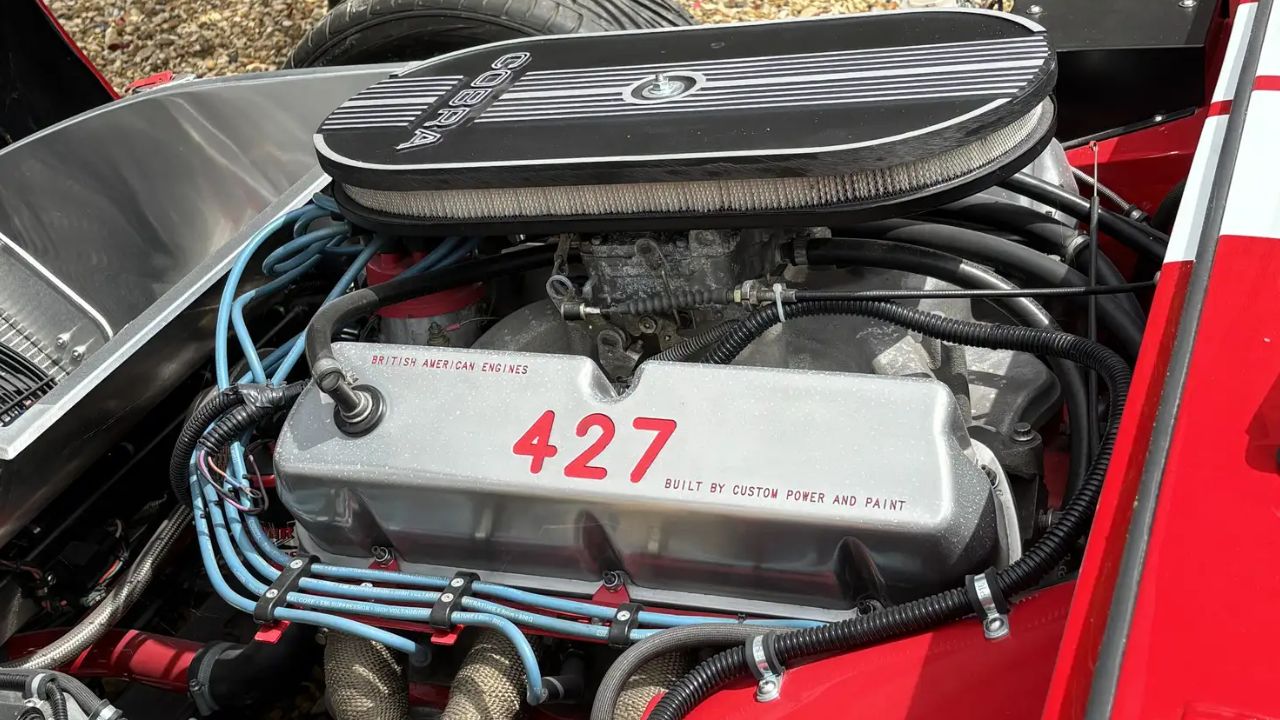 The craftsmanship here reflects both the artistry and aggression that made Carroll Shelby’s creations legendary. Period-correct wheels and side exhaust pipes complete the authentic competition look, while modern touches—like updated wiring and clean aluminum components—hint at its contemporary reliability.