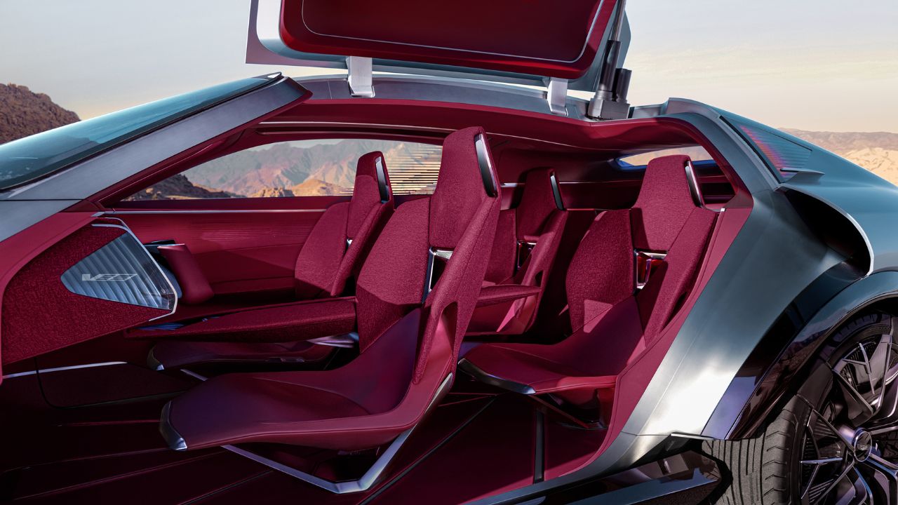 One of the concept’s biggest visual statements comes from its gull-wing doors, which open to reveal an interior focused on bespoke craftsmanship and high-end material execution. The cabin is designed to feel more like a tailored environment than a traditional vehicle interior, reinforcing Cadillac’s ultra-luxury positioning.