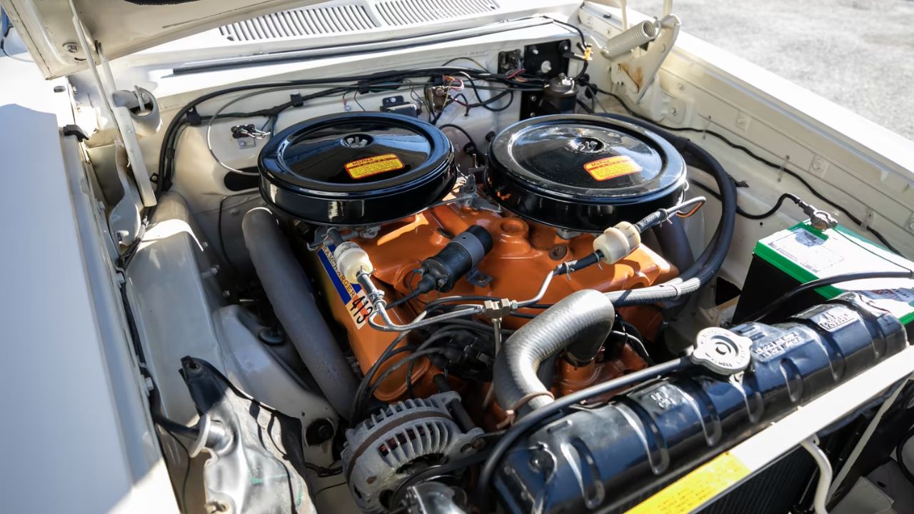 This was the beginning of Mopar’s real street-to-strip era. The Max Wedge 413 used a “short ram” cross-ram setup with staggered runners and high-riser heads. Power ratings started at 410 hp, but most were underrated. Compression ran up to 13.5:1 depending on the package.
